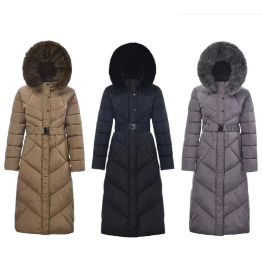 Giacca lunga in pelliccia sintetica a trapezio con cappuccio e cintura